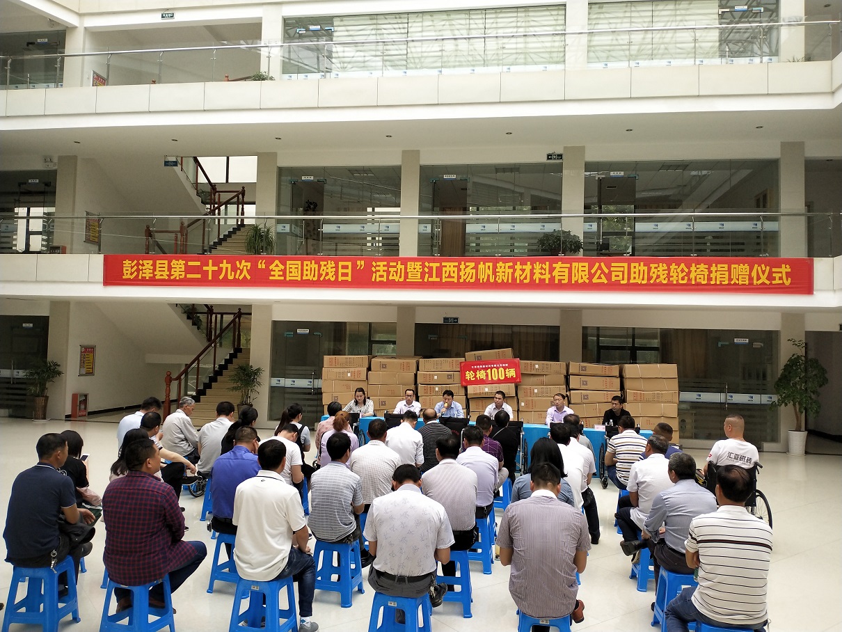 5月17日上午十點(diǎn)半,彭澤縣第二十九次“全國(guó)助殘日”活動(dòng)暨江西揚(yáng)帆新材料有限公司助殘輪椅捐贈(zèng)儀式在公司辦公樓大廳如期舉行,彭澤縣政協(xié)張仁初主任、彭澤縣殘聯(lián)宗翔理事長(zhǎng)、各鄉(xiāng)鎮(zhèn)殘聯(lián)理事長(zhǎng)、公司總經(jīng)理陳育亮、常務(wù)副總余立志及部分殘疾人代表參加了此次捐贈(zèng)儀式。