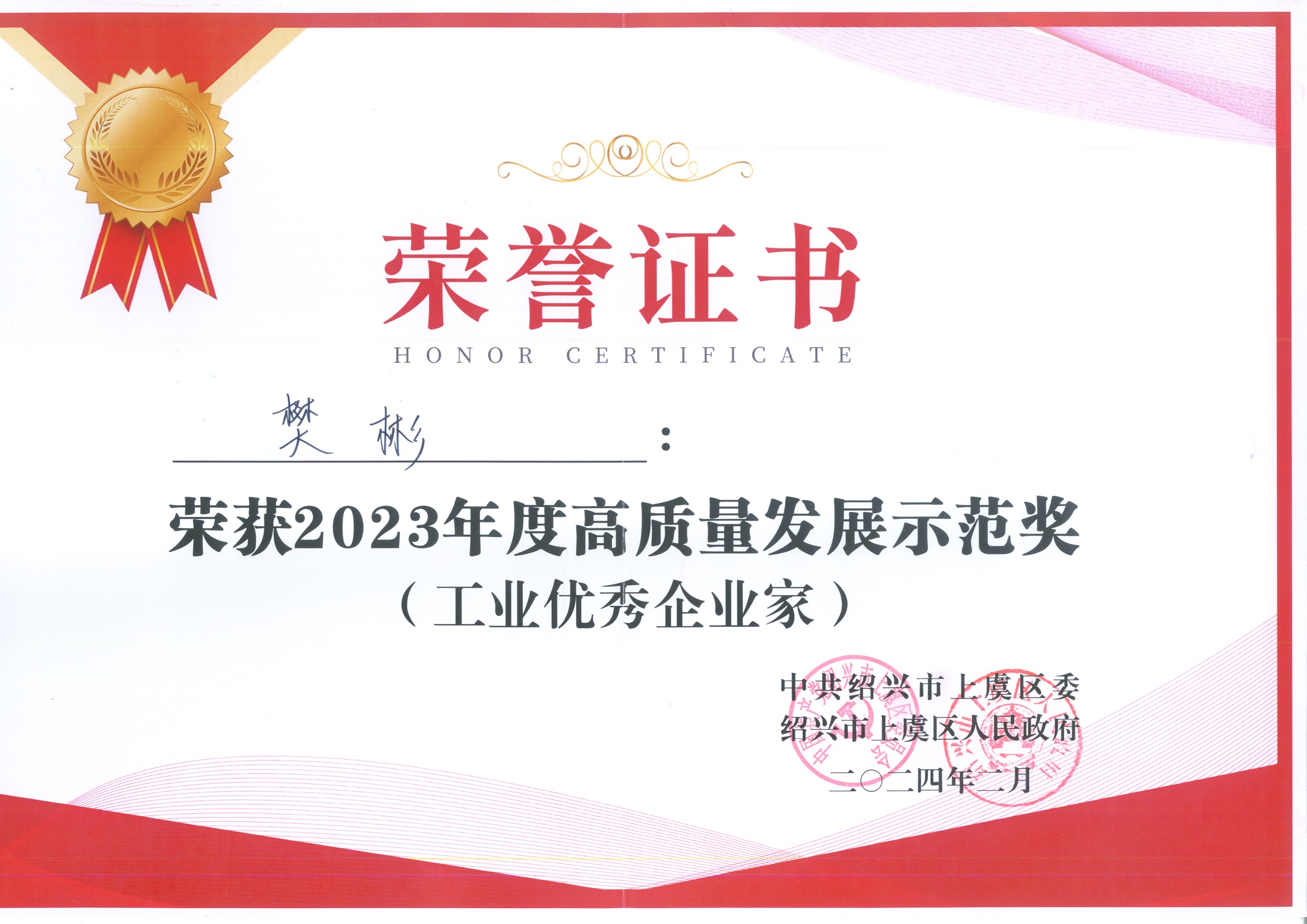 會(huì)上表彰了2023年度區(qū)級(jí)各類先進(jìn)單位和個(gè)人,并對(duì)上虞區(qū)經(jīng)濟(jì)發(fā)展做出卓越貢獻(xiàn)的企業(yè)及企業(yè)家舉行了授獎(jiǎng)儀式。浙江揚(yáng)帆新材料股份有限公司董事長(zhǎng)樊彬榮獲2023年度高質(zhì)量發(fā)展示范獎(jiǎng)(工業(yè)優(yōu)秀企業(yè)家)。