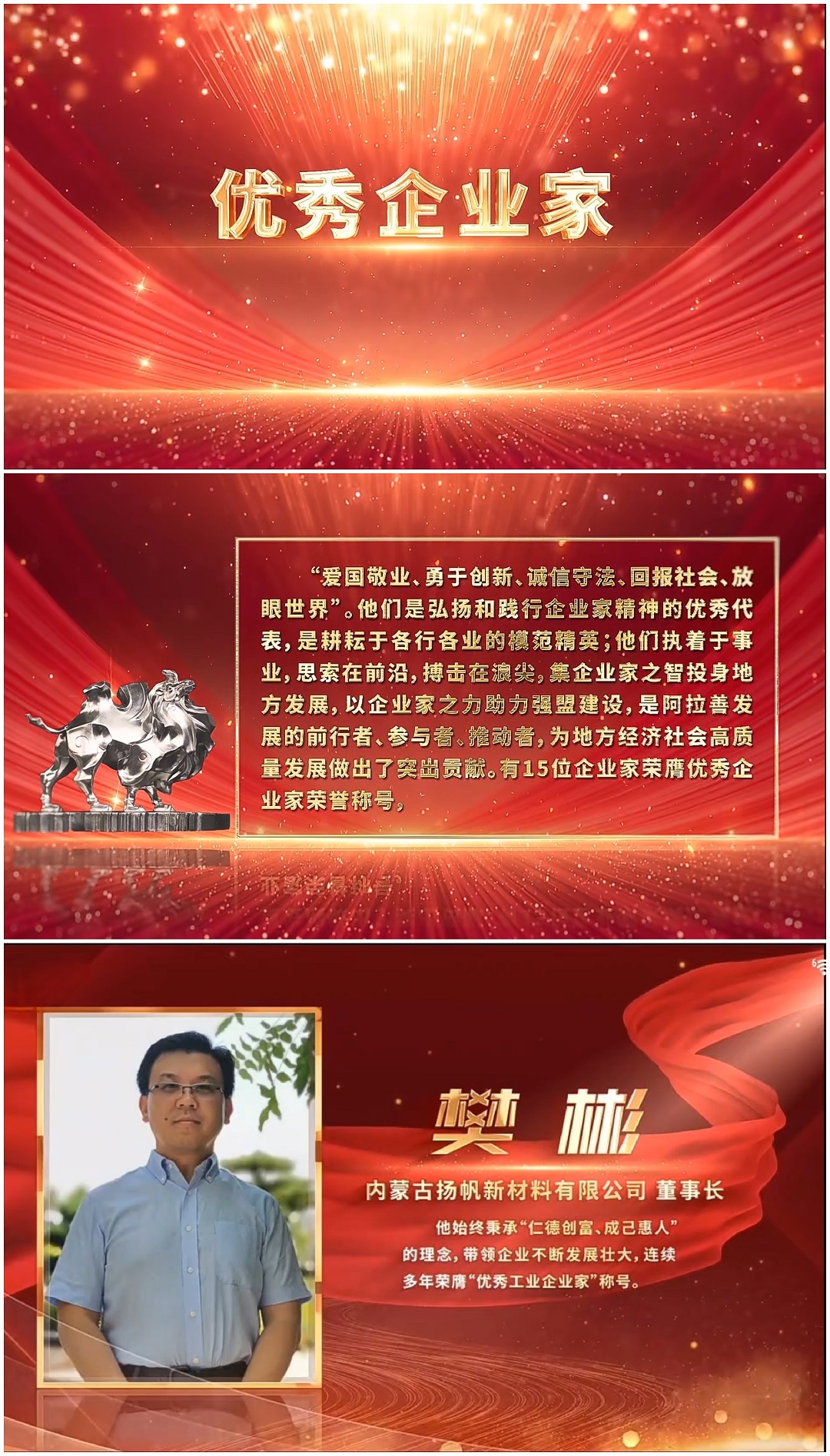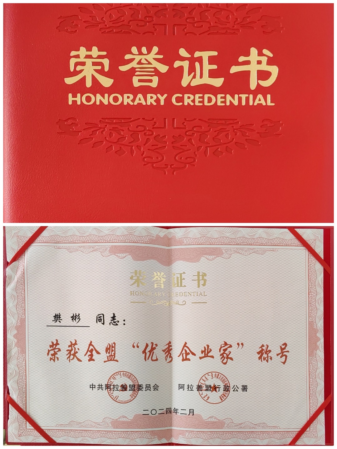 阿拉善盟委、行署對(duì)多年來(lái)建設(shè)阿拉善做出貢獻(xiàn)的優(yōu)秀企業(yè)、企業(yè)家和工程技術(shù)人員進(jìn)行表彰。樊彬董事長(zhǎng)榮獲阿拉善盟“優(yōu)秀企業(yè)家”榮譽(yù)稱號(hào)。